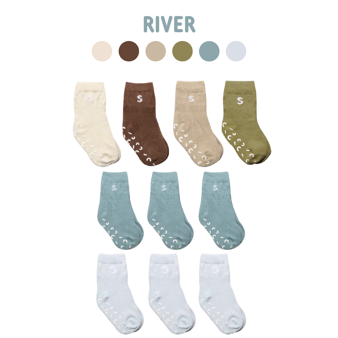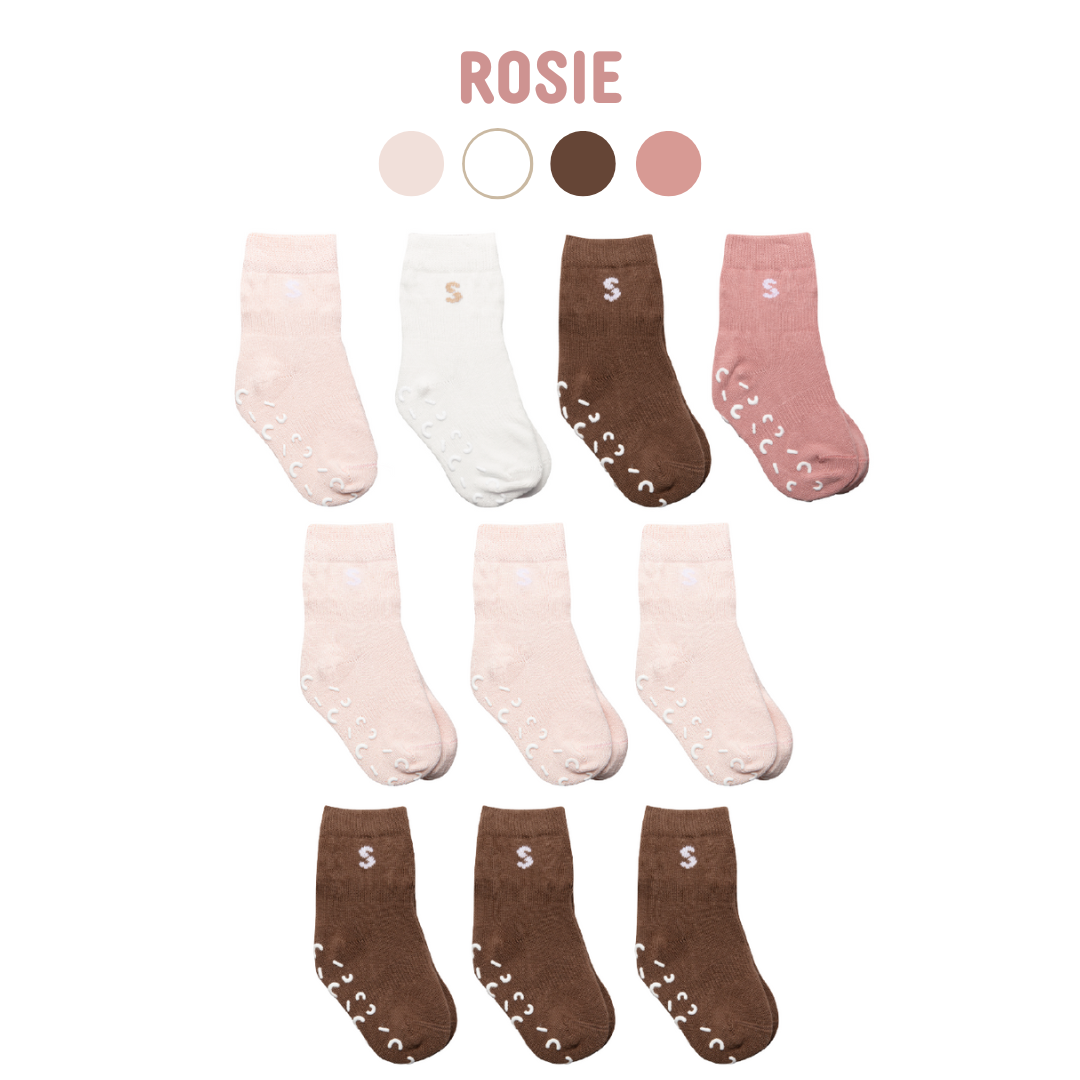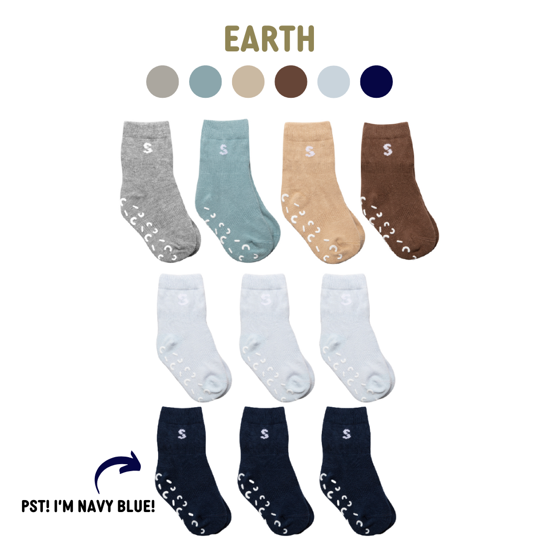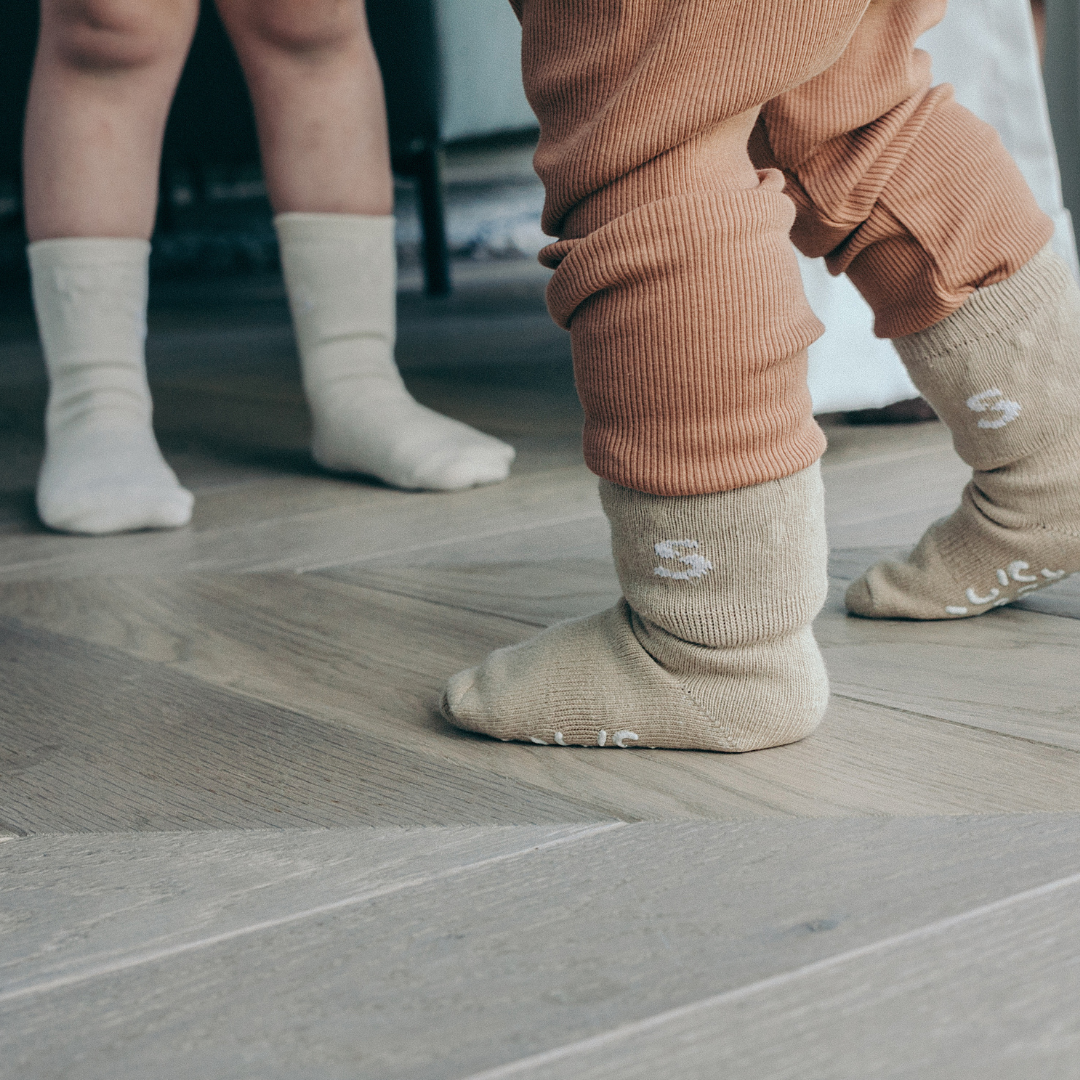 STUCKIES® are baby socks that stay on the feet—whether the child pulls on them, tries to kick them off, or is crawling. The octopus STUCKIES®' tentacles symbolize the technical solutions in the socks that help them stay on. The socks have elastic around the arch of the foot and around the middle of the cuff. They also feature dots of 100% medical-grade silicone on the inside of the cuff. The socks are certified according to STANDARD 100 by OEKO-TEX®. They have a "seamless toe" with a flat seam to avoid irritating small and sensitive toes.